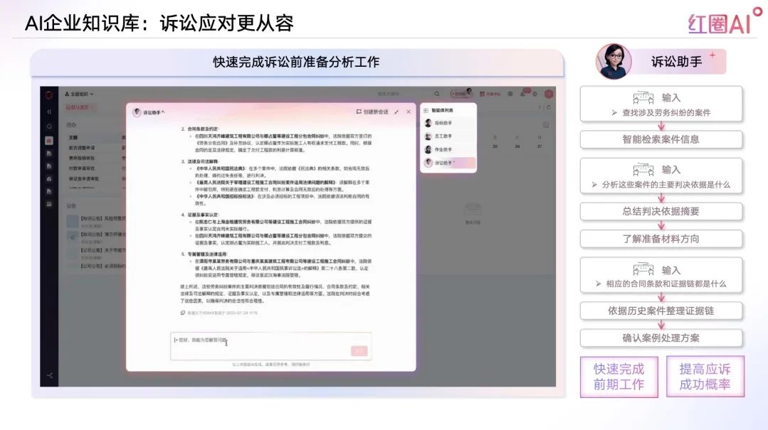 面對工程糾紛突發(fā)性強、資料復雜的挑戰(zhàn),紅圈AI構建訴訟智庫,協(xié)助法務快速調(diào)閱判例、合同、律師函、內(nèi)部分析等核心資料,高效支撐應訴與風險防控。