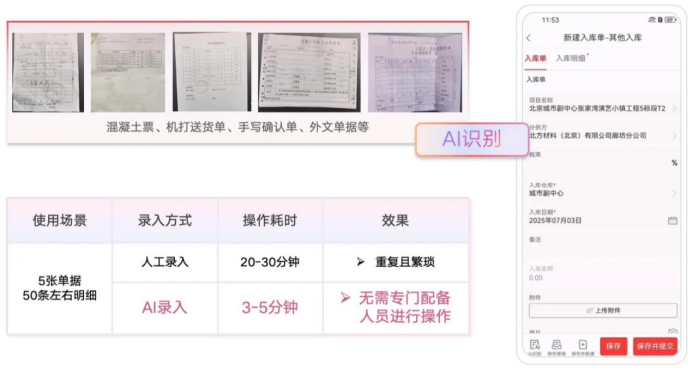 數(shù)據(jù)的源頭是業(yè)務(wù)單據(jù),錄入的繁瑣與錯(cuò)誤是成本失控的隱患之一。紅圈AI系列智能產(chǎn)品中的AI錄單助手作為企業(yè)的“智能掃描儀”,能通過大模型自動識別混凝土票、送貨單、手寫確認(rèn)單乃至合同等各類單據(jù),實(shí)現(xiàn)從圖像識別到高質(zhì)量系統(tǒng)錄入的秒級閉環(huán),可減少90%人工操作。它不僅能提取關(guān)鍵字段,更能智能匹配合同明細(xì)、關(guān)聯(lián)歷史數(shù)據(jù),讓成本歸集更智能、溯源更方便,從而迭代了整個(gè)成本管控流程。